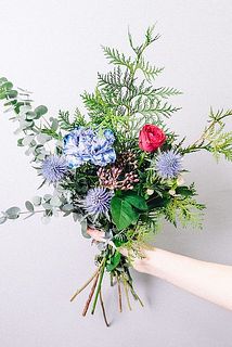 真紅のバラにブルーのカーネーションやエリンジウムなどを組み合わせたシックなホリデーブーケ🎅