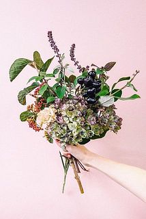 アンティークカラーがおしゃれな紫陽花のブーケ。この時期の紫陽花は水分が少なく、ドライフラワーにもおすすめです。くすみカラーのカーネーションや秋を感じる枝物と一緒に束ねました🍁紫陽花は深水で活けましょう。