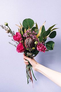 ビビッドなオレンジと淡いグレーのバンクシア「ココシニア」は、まるでフェルトと針金で作られたような、なんとも不思議なお花。花言葉は「心地よい孤独」「勇気ある恋」。リューカデンドロンやワックスフラワーなど、南アフリカ原産のネイティブフラワーを贅沢に束ねたブーケです。