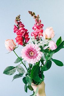 フランス語で「幸運」を意味するバラ「ラ・シャンス」をメインに、スナップ「メリーランドフラミンゴ」を束ねて。