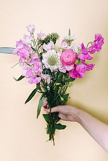 ラナンキュラス / チューリップ / スイートピー / スカビオサ / サクラコマチ / てまり草 / デルフィニウム / ユーカリ