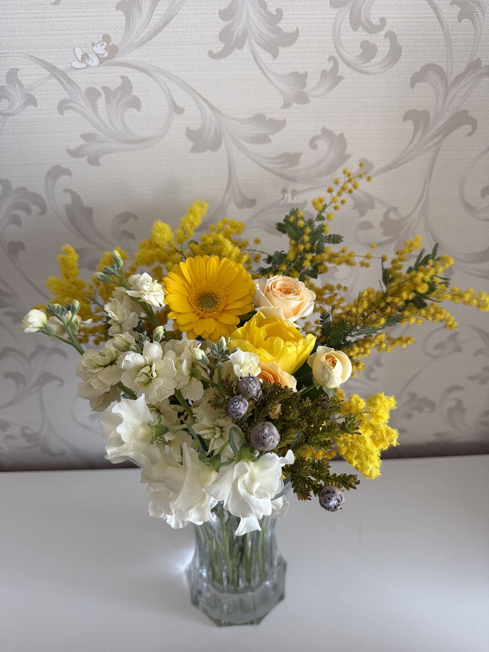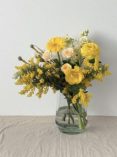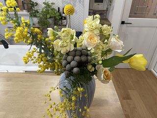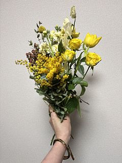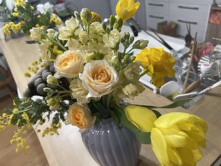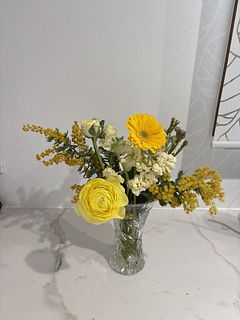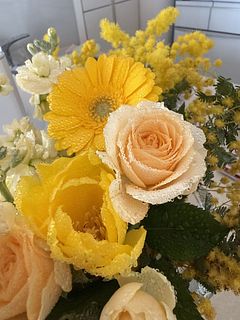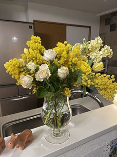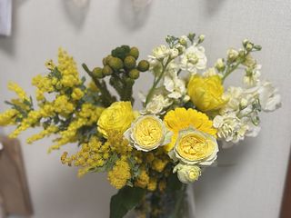 ミモザが沢山入って、春らしいとっても可愛いブーケでした💐 チューリップが終わりかけか、首が曲がってしまって生けれませんでした🥺 でも、大変満足です🥰