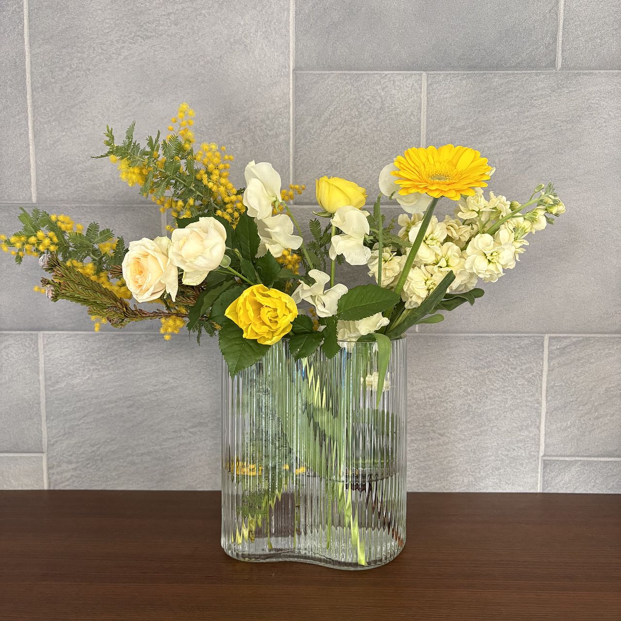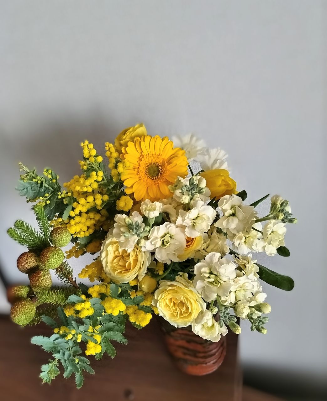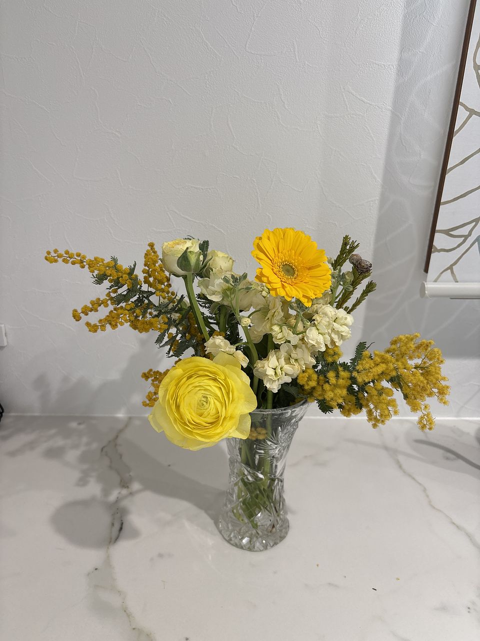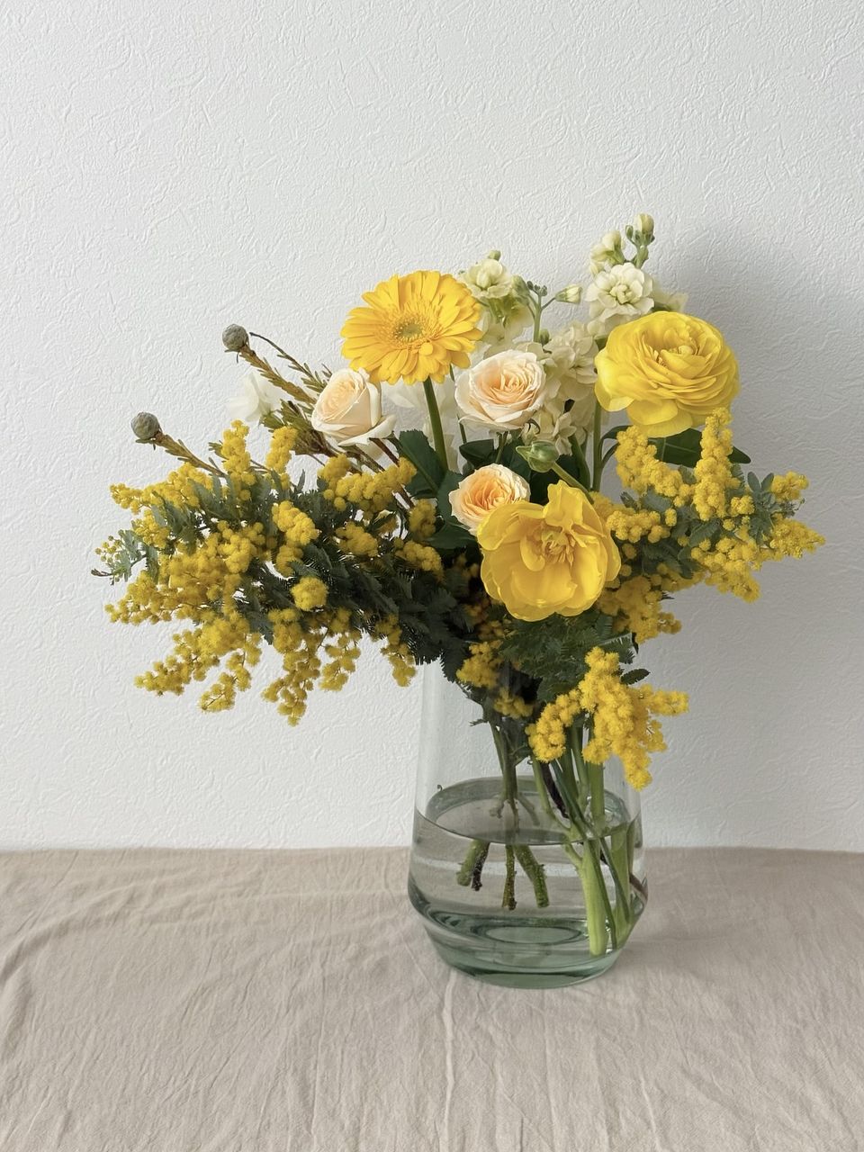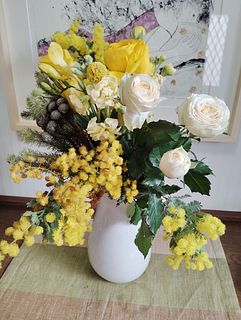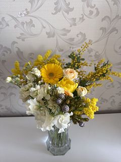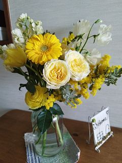 全体的によかったですが、 1種類かさましにはいってる感じで全体に合わない花が1種類入っていました それをチョイスした人のセンスが悪いと思います 一種類だけど別の花瓶に入れました 白がかなり多く残念でした 黄色がもっと入ってもよかったと思います やはり見本とは違いますね でも1種類以外は気に入ってます でもその一種類がかなりかさ増しなので影響します またミモザだけで頼みたいです ありがとうございました