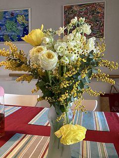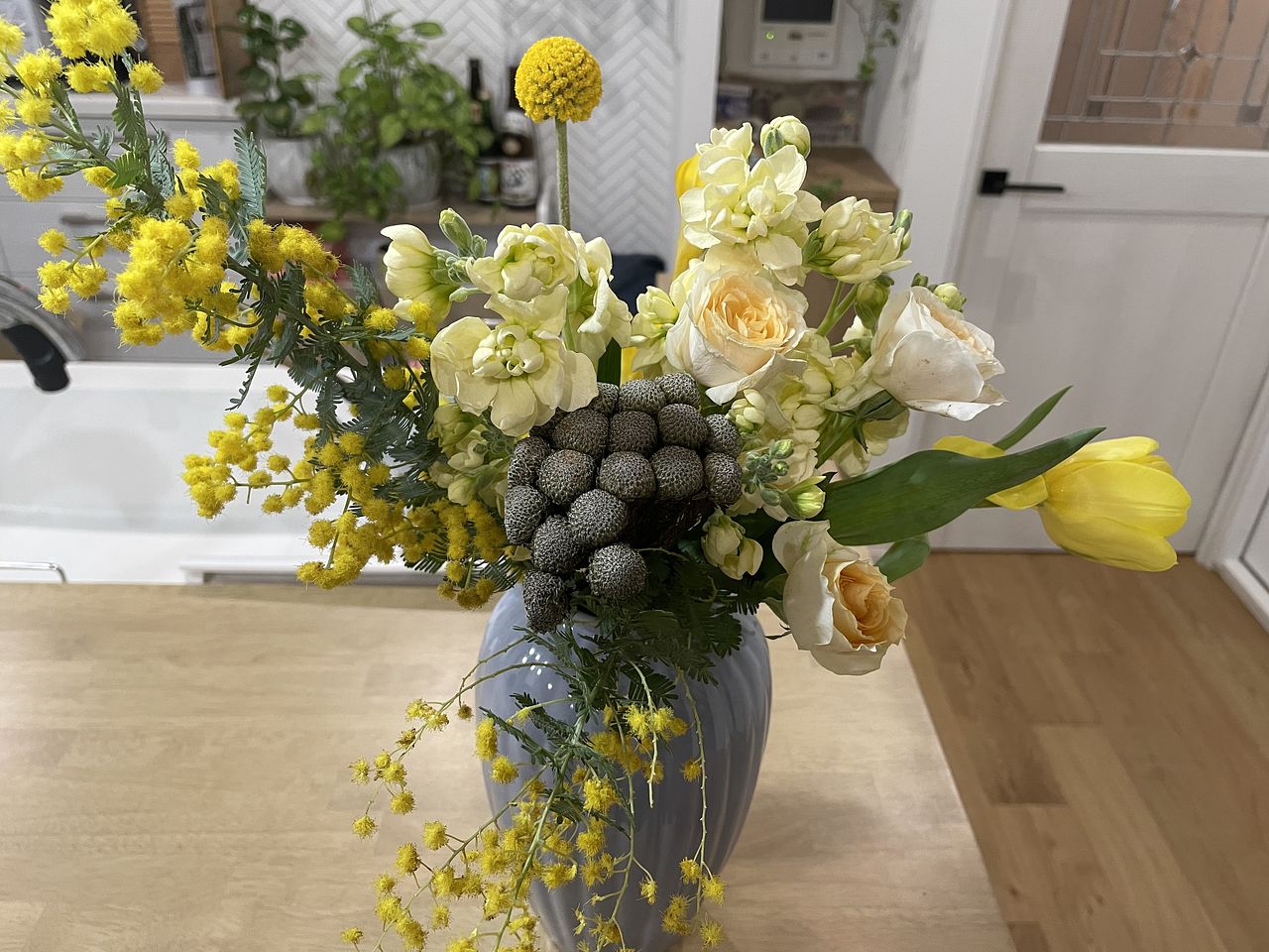 ミモザはフワフワで色々な種類の花たちからいい香りがしています。部屋が明るくなりました。