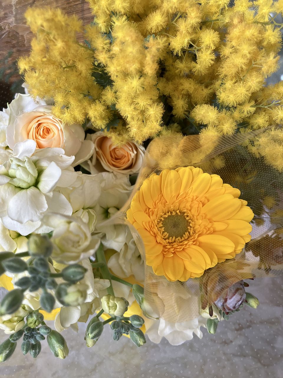 ミモザの黄色いお花はビニールを剥がそうとしたらほとんど取れてしまいました😭 他の黄色のお花が可愛かったので大丈夫です🙆♀️