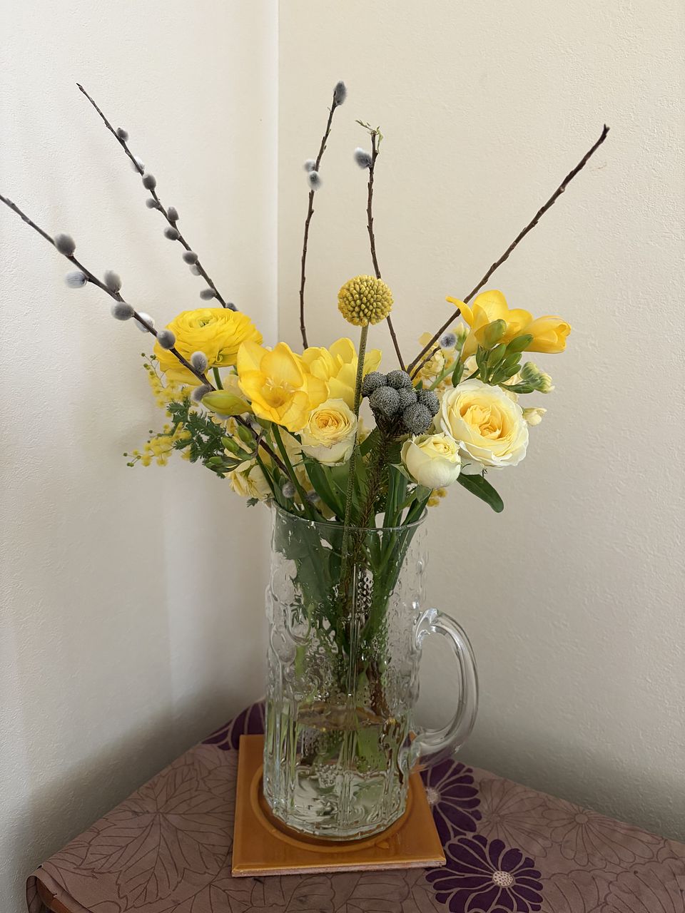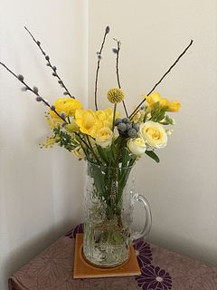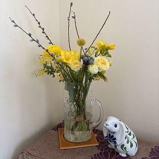 ボリュームよく、バリエーションもありお買い得感がありました。ミモザは、少し古かったようです。 もう、終盤なのですね。 黄色いブーケは少ないので、楽しく飾りました。 庭のネコヤナギを足してみました。