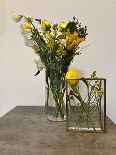色やボリュームもよくてミモザも咲いていてよかったんですが。チューリップが首がおれてて。なので短くして小さい器にいけました。全体的にはよかったです。