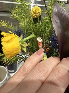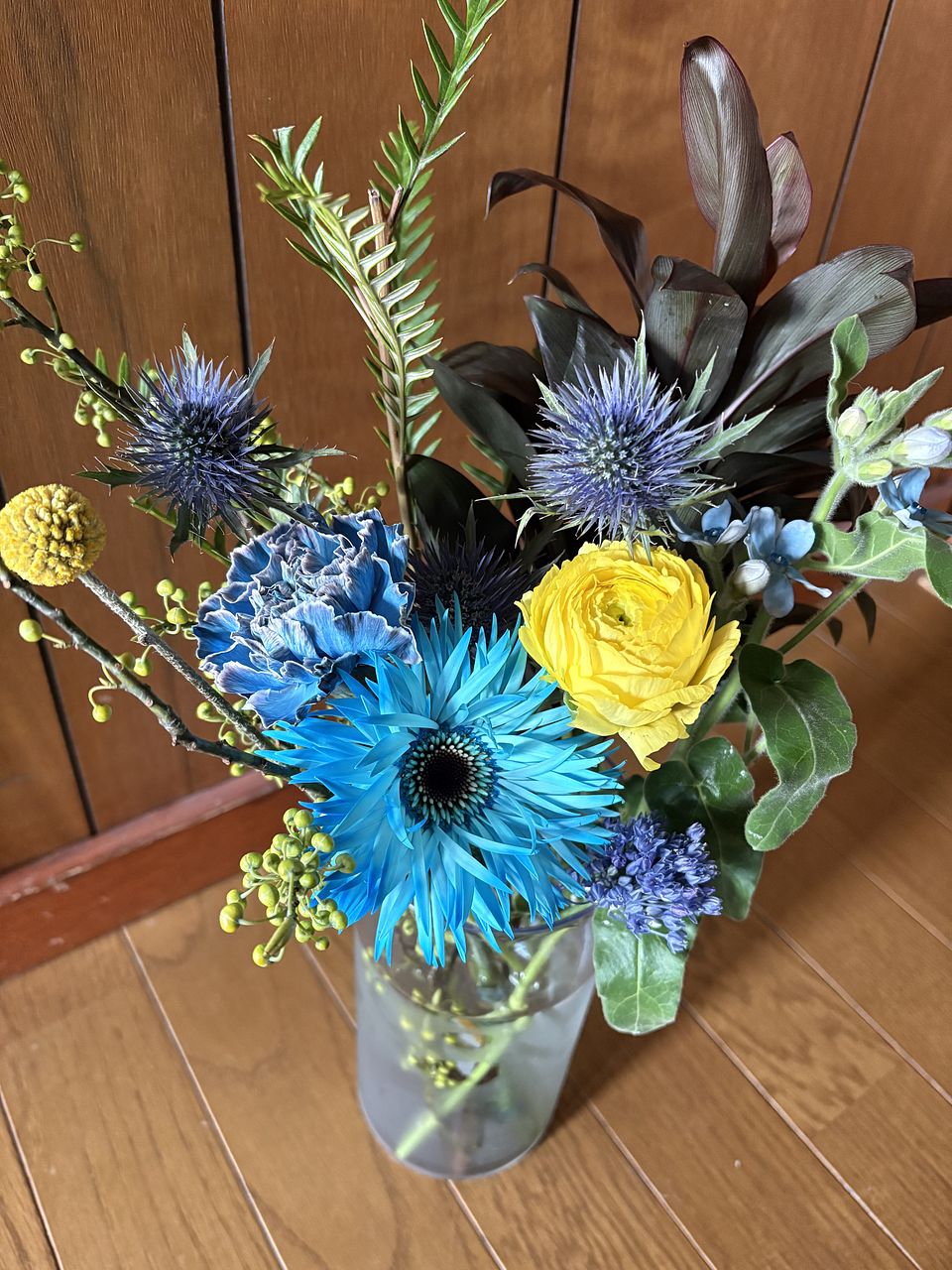 ブルーとイエローが鮮やかで元気が出ます。枝物もいい具合に入っていて良かったです。 切り取って出た小さな枝も小さな瓶に入れて飾ってます♪