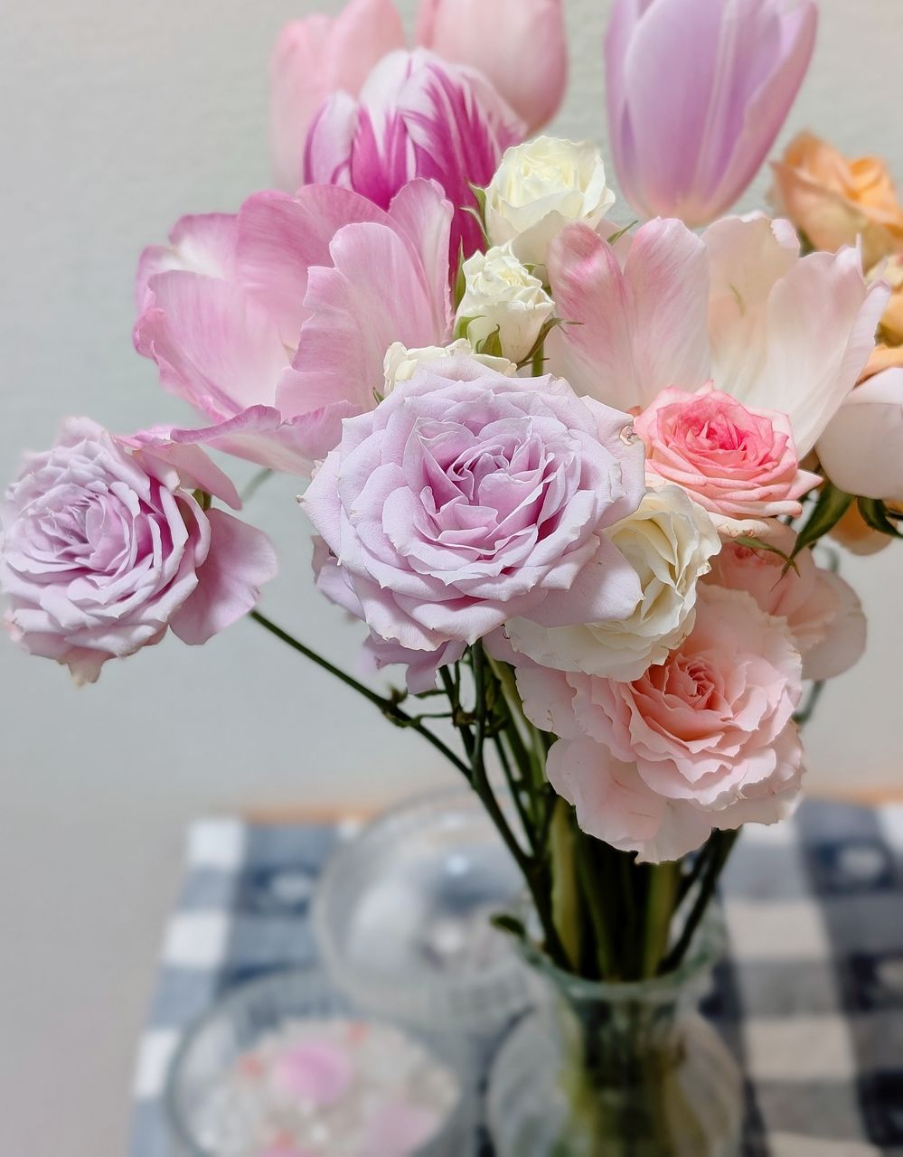 淡いピンクのスプレーバラとチューリップ🌷