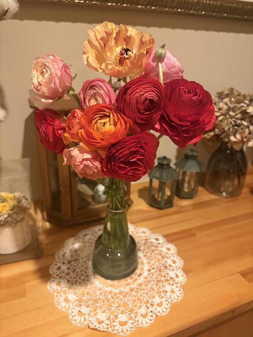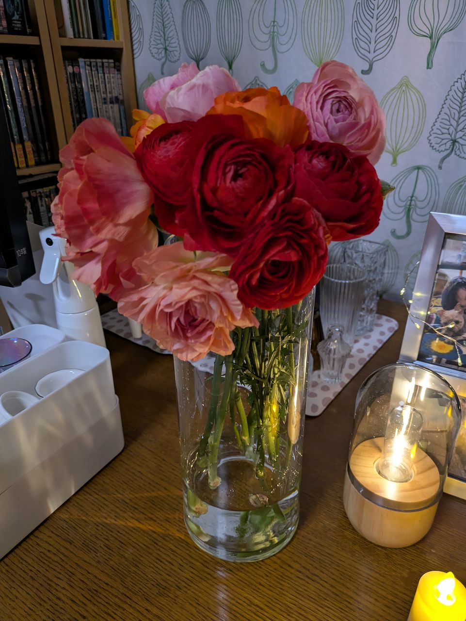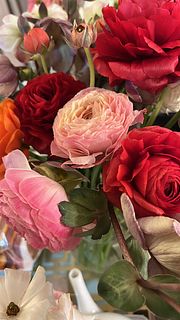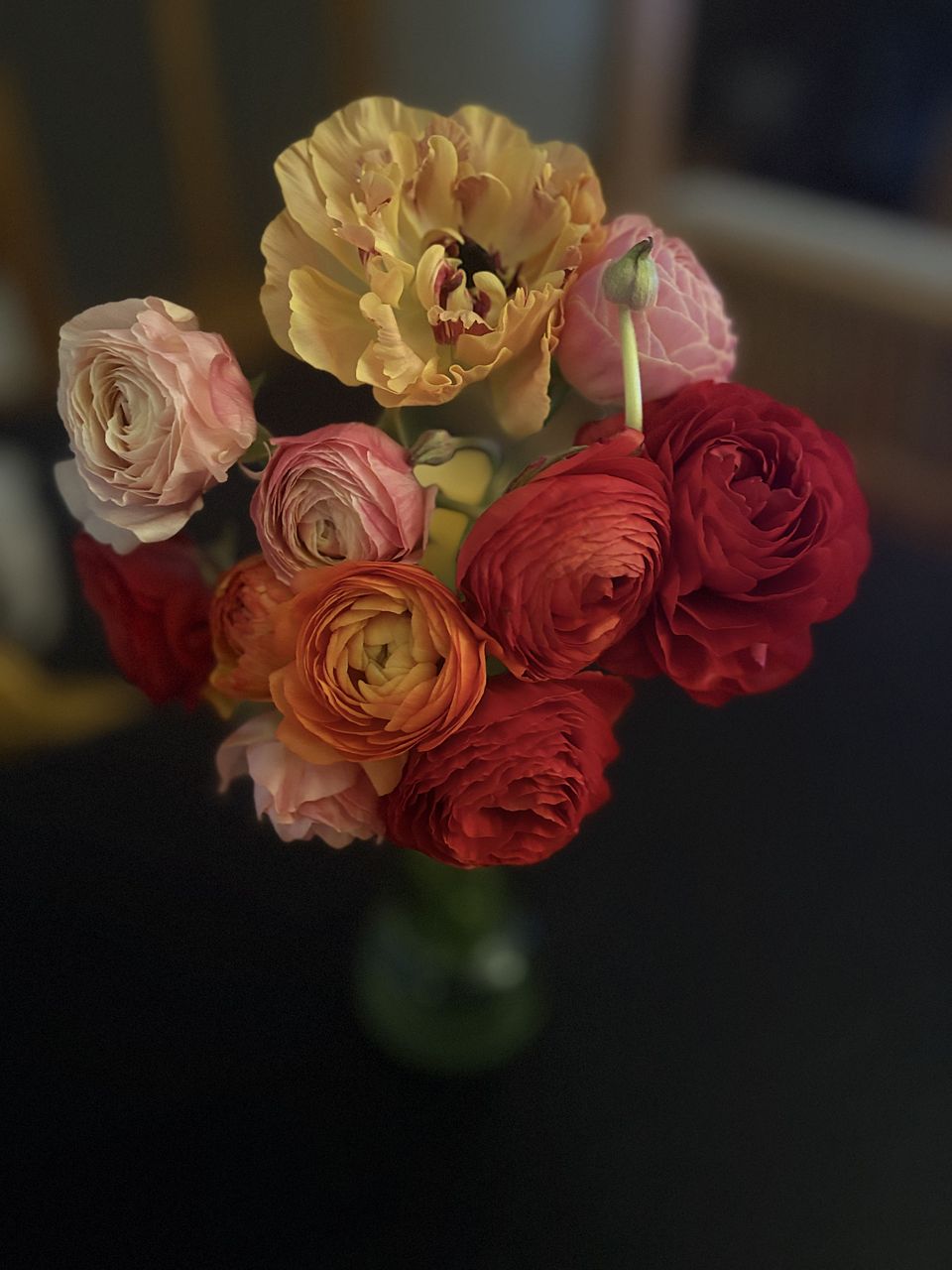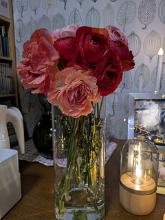 写真を見て変わった柄や咲き方の品種が1〜2本くらい入るのかなと思っていたのですが、いたってノーマルなものが4色入っていて、期待していたより普通のブーケでした。ただし、10本と商品ページには書いていたのですが 、咲いているものが11本と蕾が3本も入っていて、元々がお手頃なのにずいぶんサービスしていただいてるんだなあとありがたく思いました。首が垂れ下がっていて直らないものが1本、心配なものが2本あり、特にその1本は撮影後紙を巻いて補正中です。