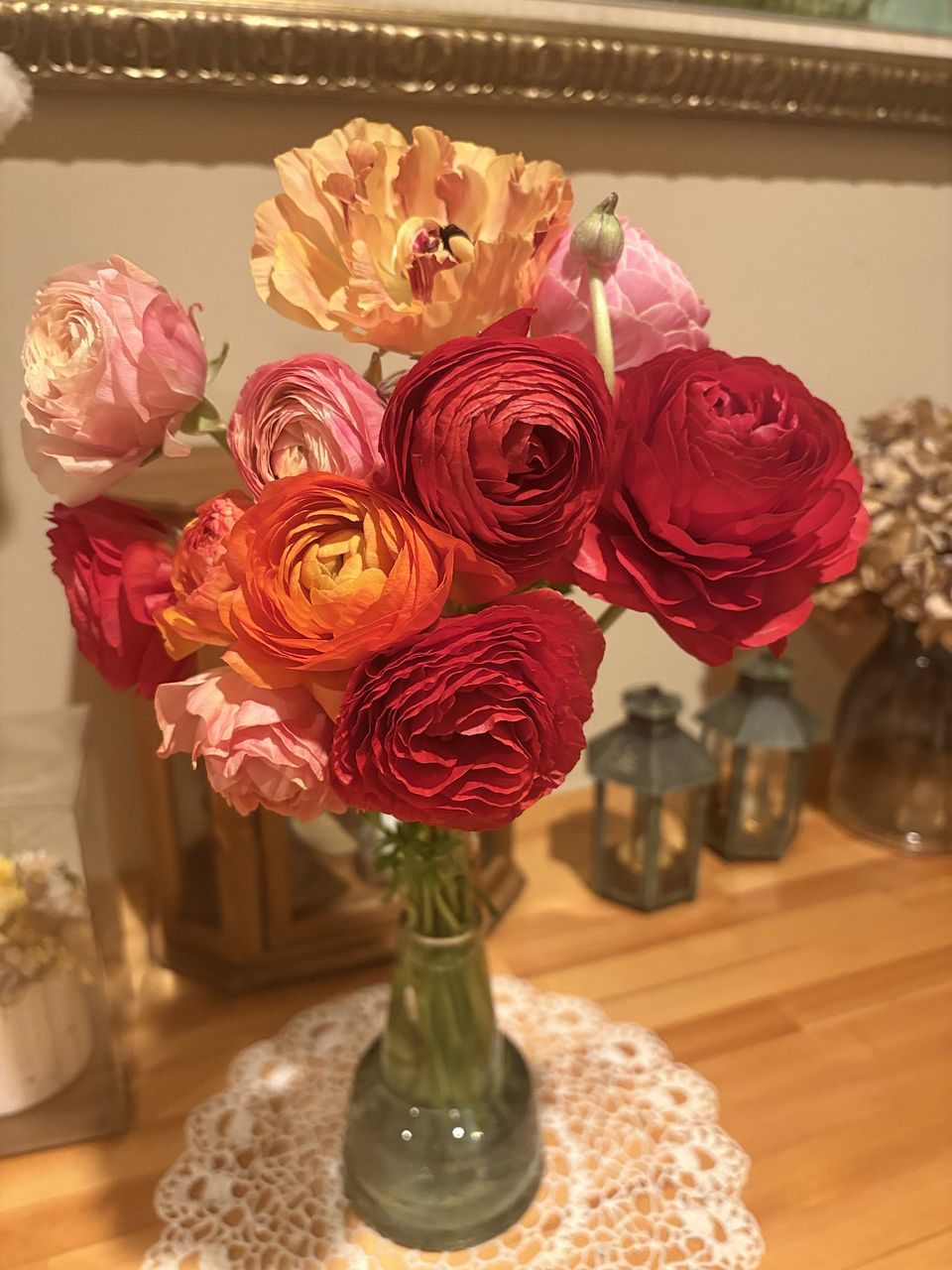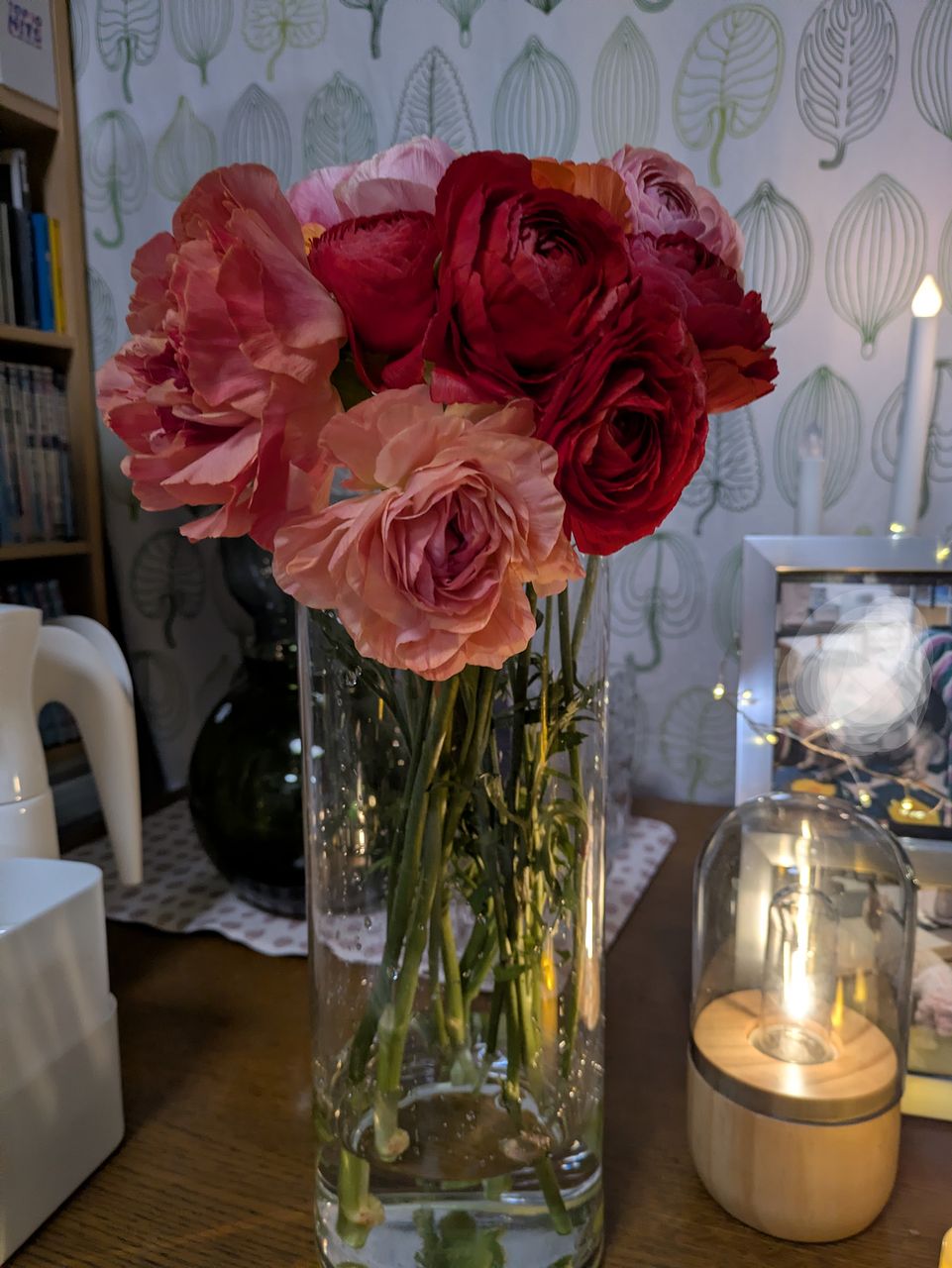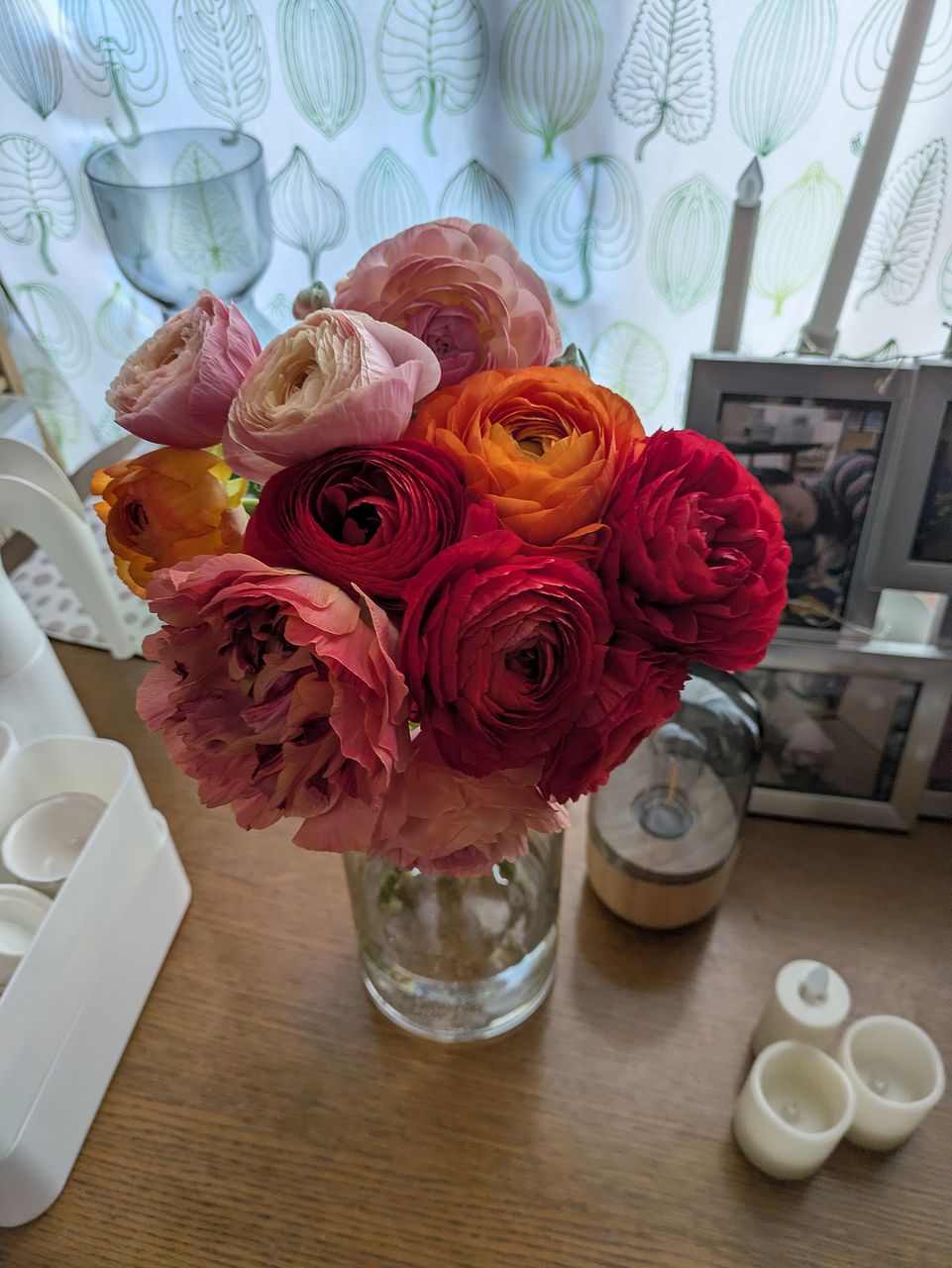 写真を見て変わった柄や咲き方の品種が1〜2本くらい入るのかなと思っていたのですが、いたってノーマルなものが4色入っていて、期待していたより普通のブーケでした。ただし、10本と商品ページには書いていたのですが 、咲いているものが11本と蕾が3本も入っていて、元々がお手頃なのにずいぶんサービスしていただいてるんだなあとありがたく思いました。首が垂れ下がっていて直らないものが1本、心配なものが2本あり、特にその1本は撮影後紙を巻いて補正中です。