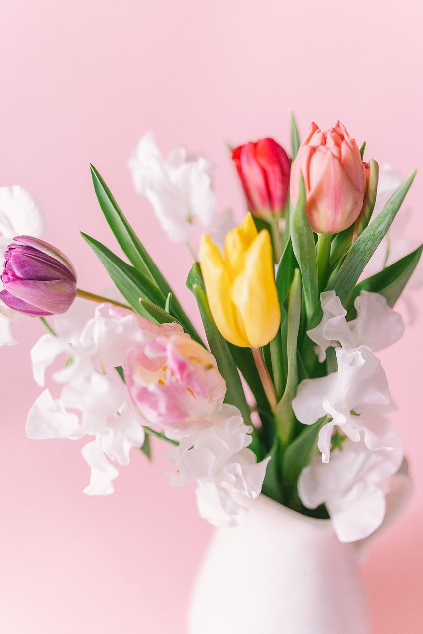 チューリップたちと雪のように真っ白なスイートピーとの組み合わせが魅力のブーケです。