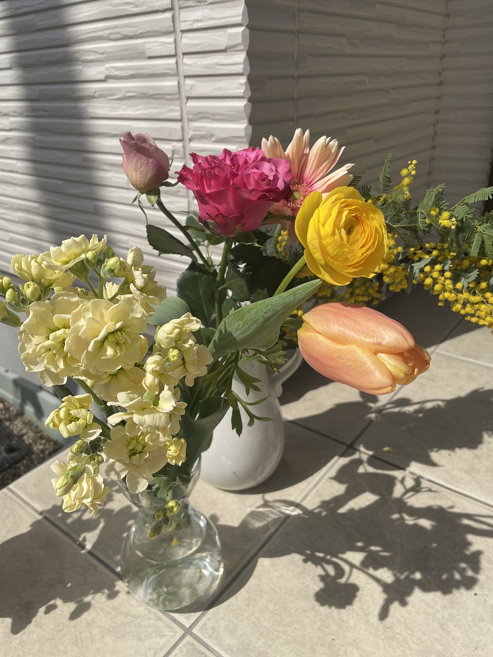 とても可愛いです。特にミモザが入っていて嬉しかったです。あとはチューリップ、ガーベラ、ストック、バラです。2つに分けて花瓶に入れました。