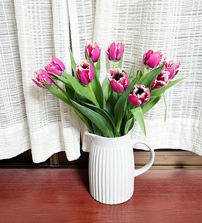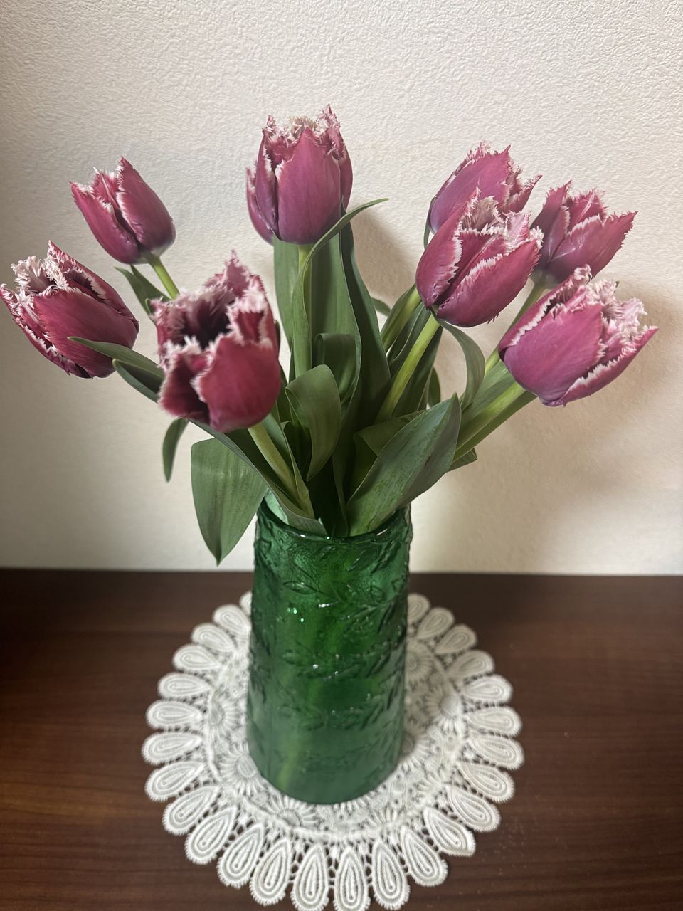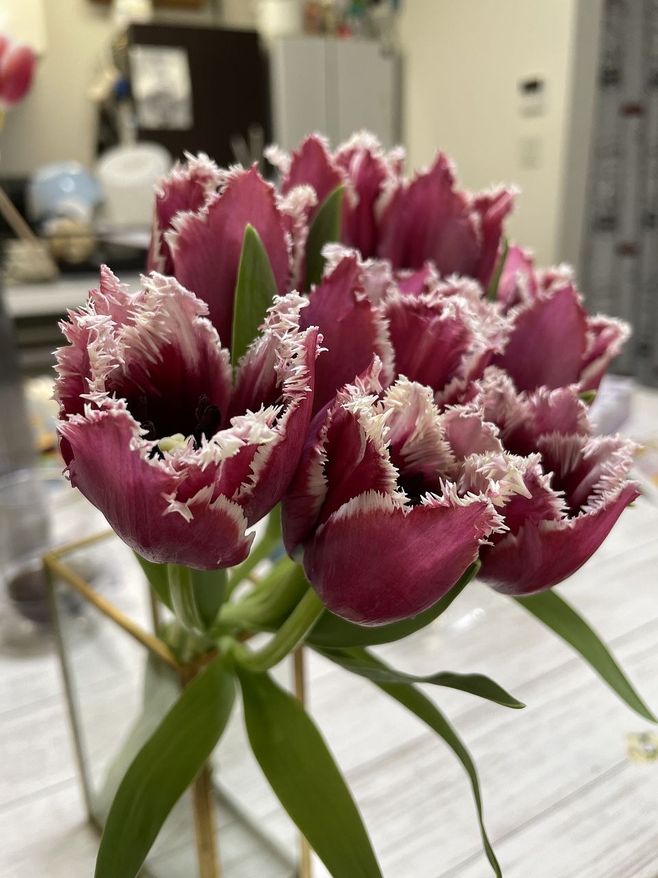 箱を開けた途端に可愛いフリルなチューリップが見えて、テンションが上がりました⤴️ しっかりと水揚げをして、10本全部きれいに揃っています!これからもう少し開いてくるのも楽しみです😍 ちょっと大人っぽい色合いも好みです💕