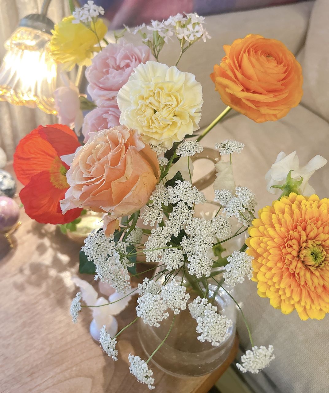 オレンジやイエロー、ピンクのお花を見るだけで気持ちがふっと和らぐような組み合わせにしてみました🍊