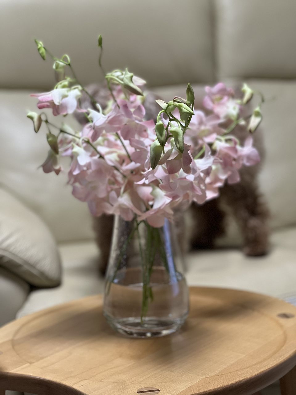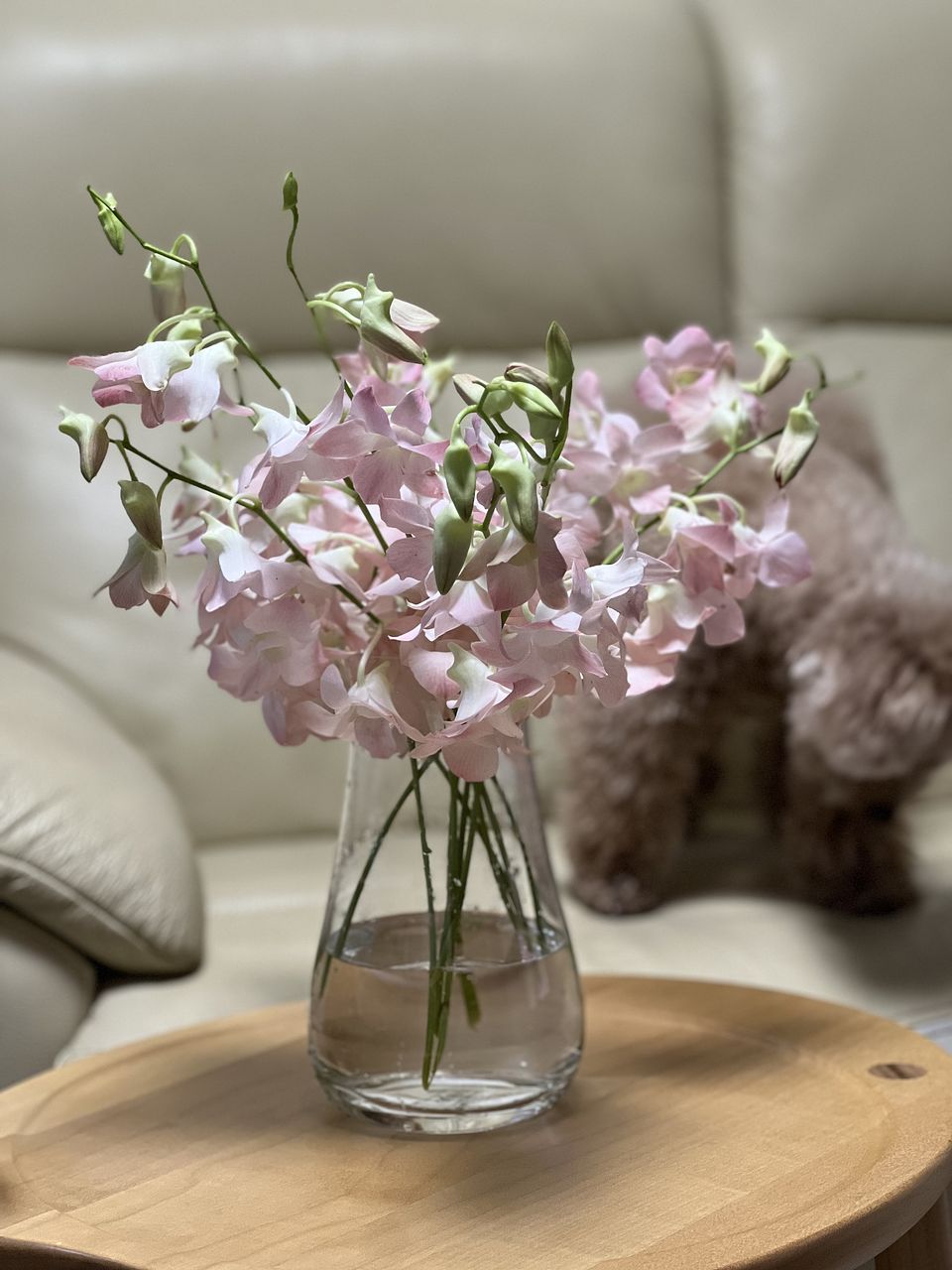 桃のような色合いがかわいい🍑淡いアプリコットピンク色のデンファレ「アプリコットロマンス」または「ジンダスィート」をたっぷり9〜10本お届けします。