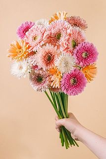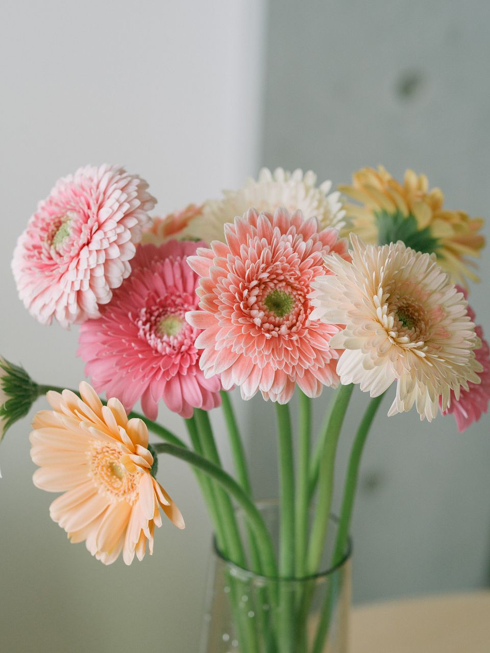 アプリコットピンクやコーラルピンク、ホワイトピンクなどニュアンスカラーのガーベラをギュッと束ねました🍑ころんとした咲き方が最高にキュート。
