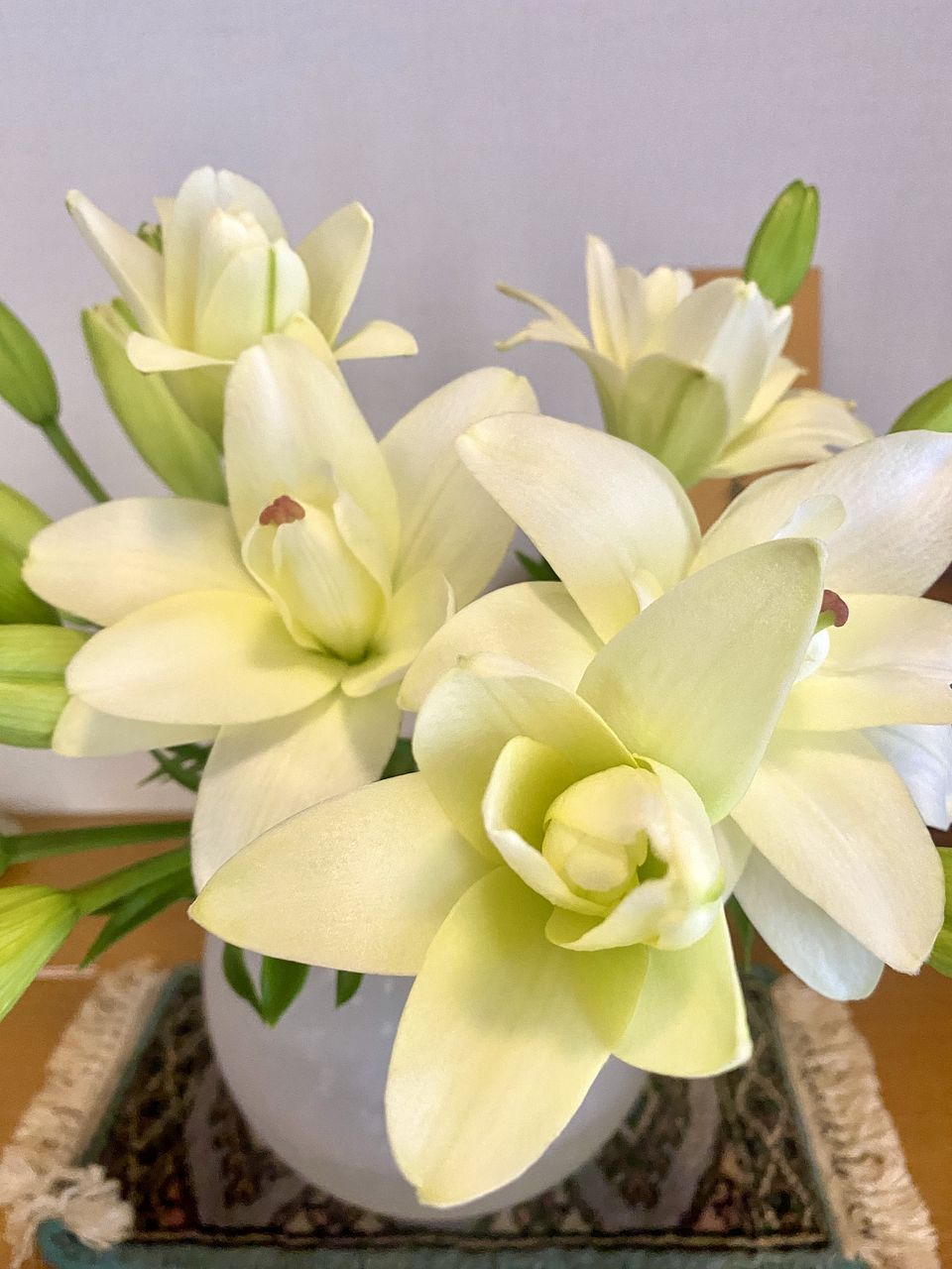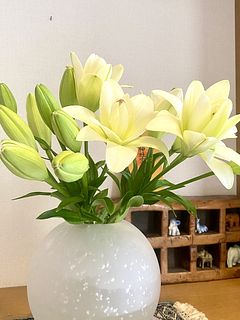 お花が届いた時は全部蕾でした。 水揚げして花瓶に入れると開き始めました。 可憐で可愛いお花です。 花粉がないのもいいですね。 いつもありがとうございます。