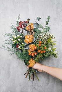 もこもこのコットンフラワーが主役のブーケ。ブラウンのコットンフラワーは別名「テディベア」とも呼ばれています🧸ルビーのようなバラの実は「アメイジングファンタジー」という品種。そのまま吊るしてドライにできるブーケなので、クリスマス気分を長く楽しめます。