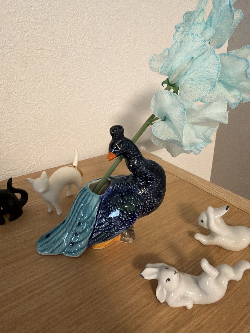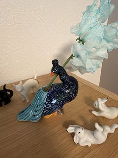 羽づくろい中かな...😌こちらを振り向く姿が美しいクジャクの一輪挿しはインテリアとしてもかわいいです🦚