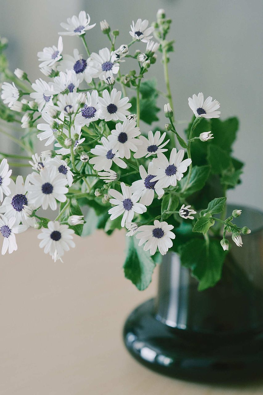 まず茎先をカットし、茎の7〜8割が浸かるイメージで深いお水に数時間つけてあげて。水圧で花に水が届きます。水揚げが完了したら、毎日のお世話は浅水〜中くらいの水量で。水換えはこまめにしてあげましょう。切花の栄養剤を使うと、バクテリアの増加を減らせるのでおすすめです。