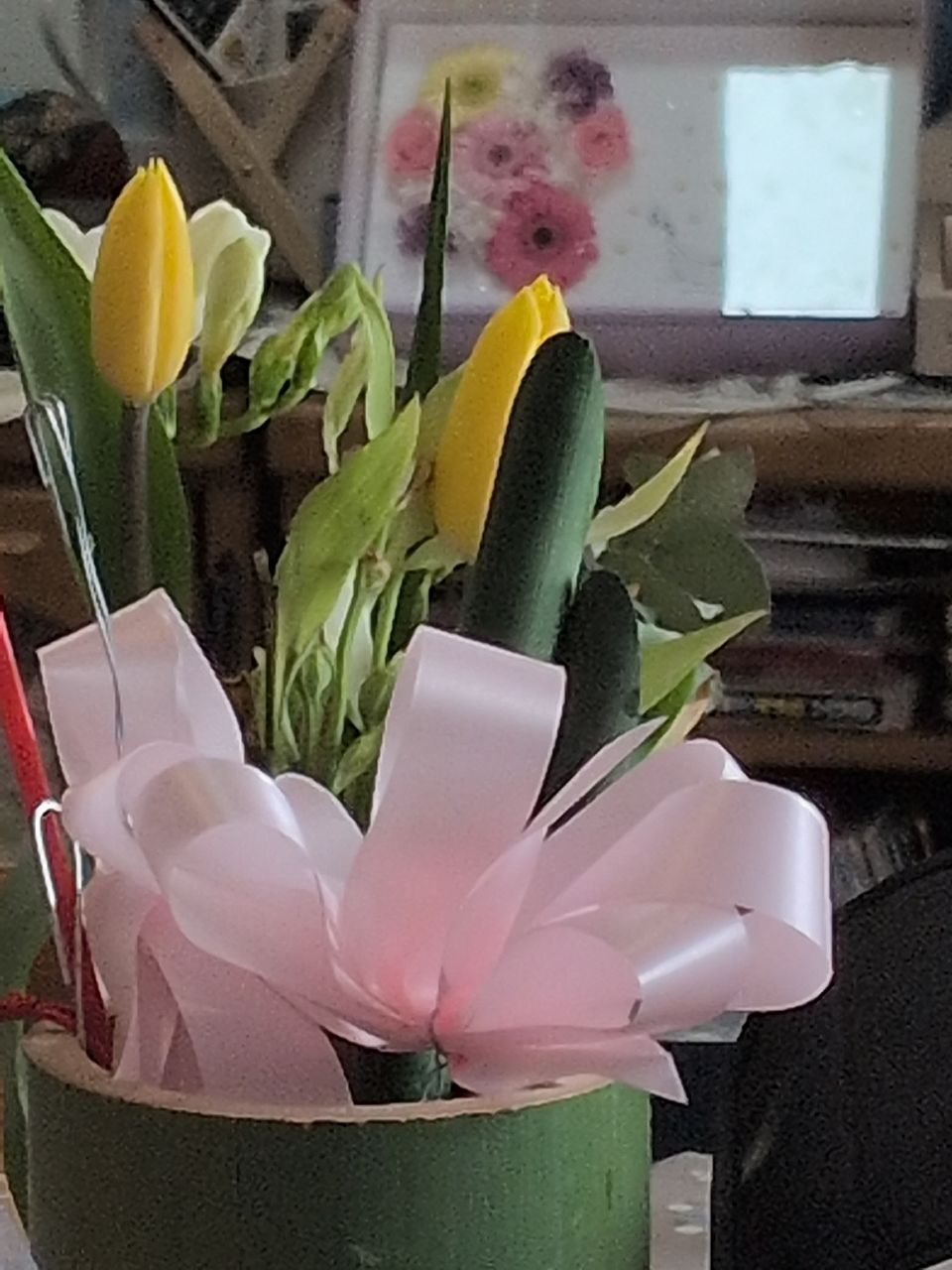 黄色はお部屋を明るくしてくれますね。いつもシックなお色を選びますが、今回は名残りの幸運チューリップを楽しみます。