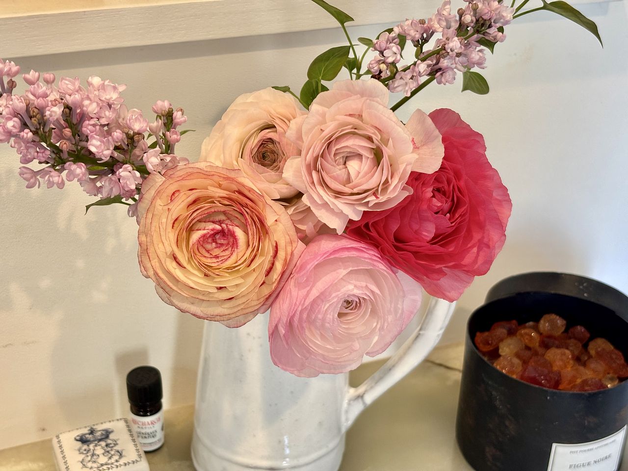 1本元気がない状態のラナンキュラスがあり、水あげを頑張りましたが回復せず。他のラナンキュラスに支えてもらって何とか咲いていましたが、今は短く切って小皿に移しました。 とは言え、他の花たちはまだまだ元気に咲いています。