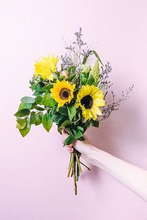 ひまわりとブルーベリーを組み合わせた初夏にぴったりのブーケ🌻花言葉は「実りある人生」。ブルーベリーの実は取れやすいのでやさしく扱ってあげてください。※熟していないので、食べてもあまりおいしくありません...😯