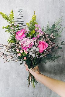 バラ / ガーベラ / カーネーション / ハイブリッドスターチス / シルバーブルニア / ヒペリカム / スイートピー / ユーカリ / クジャクヒバなど