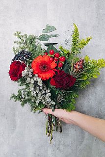 カーネーション / フリジダ / ヒペリカム / ガーベラ / バラ / プルモサス / クジャクヒバ / ヒムロスギなど