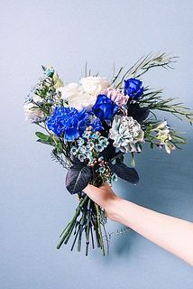 めずらしいブルーのワックスフラワーを使ってデニムの青をイメージしたブーケを作りました。カーネーション「コバルトブルー」やバラ「アヴァランチェブルー」を組み合わせて。涼しげなカラーをお部屋に飾りませんか?バラやカーネーションは染色しているため、水の色が青くなることも。染色剤が手に付いてしまったら、石鹸で洗うと落ちますのでご安心を。※カーネーションの色は写真と印象が異なることもあります。ご了承ください。