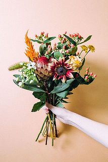 チョコレート色のひまわりにプロテアを組み合わせて。ケイトウ「アプリコットブランデー」は思わず触りたくなる質感。花言葉は「おしゃれ」。大人っぽい色合いでまとめたサマーブーケはいかが?