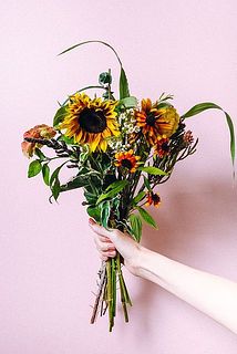 アンティークカラーのひまわりが主役。お部屋の雰囲気をぐっとおしゃれにしてくれます。ひまわりを長く楽しむコツは、花器の水を少なめにすること。茎のうぶ毛が水質を悪くする要因になるため、水に浸かる部分はなるべく少なくしましょう。お水は毎日変えてあげてください。メガネヤナギの葉はくるくるでユニーク👓
